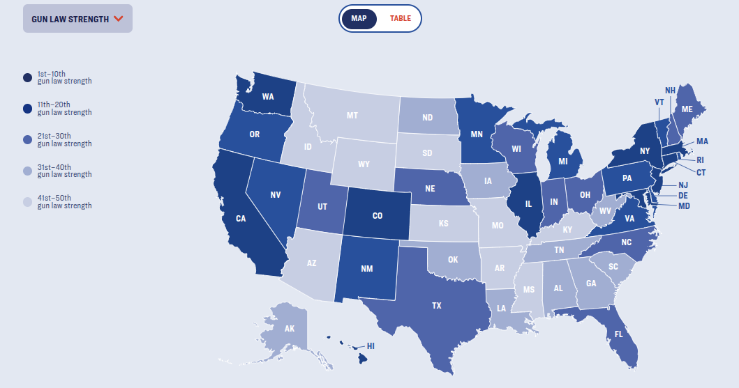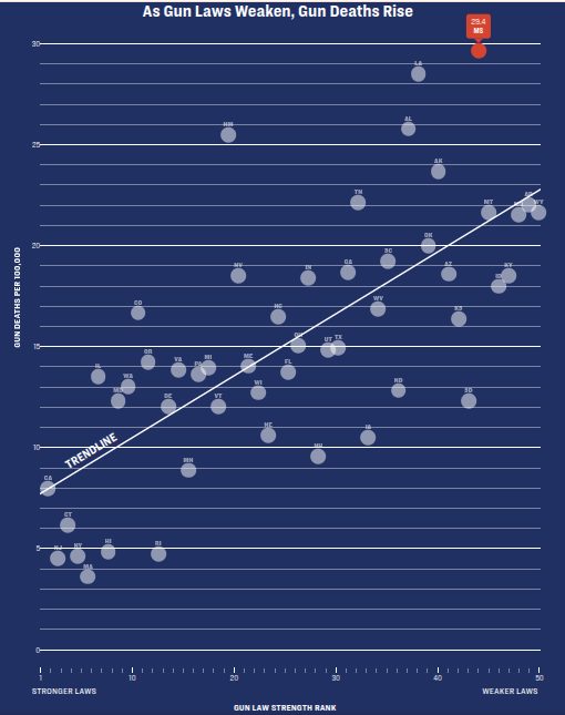 The effectiveness of gun laws can most easily be seen by charting states based on the strictness of their gun laws and the level of gun deaths, as shown in this chart from Gifford’s Law Center to Prevent Gun Violence.
