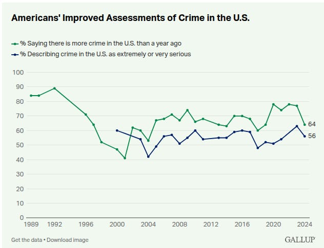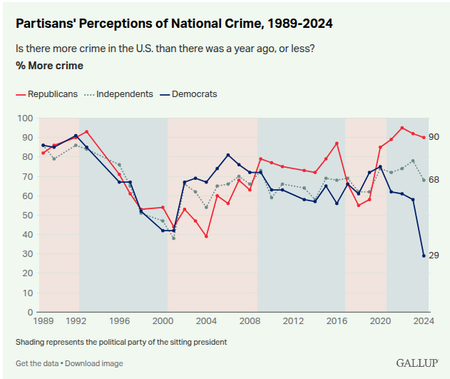 2024 saw some of the largest crime declines in history. It was not hard to find this data in a wide variety of forms from many different sources. Despite this, 90% of Republicans believed crime was worse in 2024 than it had been in 2023. Only 29% of Democrats thought crime had worsened in 2024, the lowest on record since at least 1989.