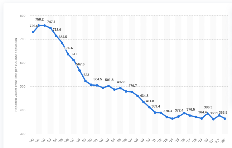 That graph stops at 2023, so it is worth noting that crime saw a substantial decrease in 2024, and reports on the first half of 2025 show those steep declines continuing.
