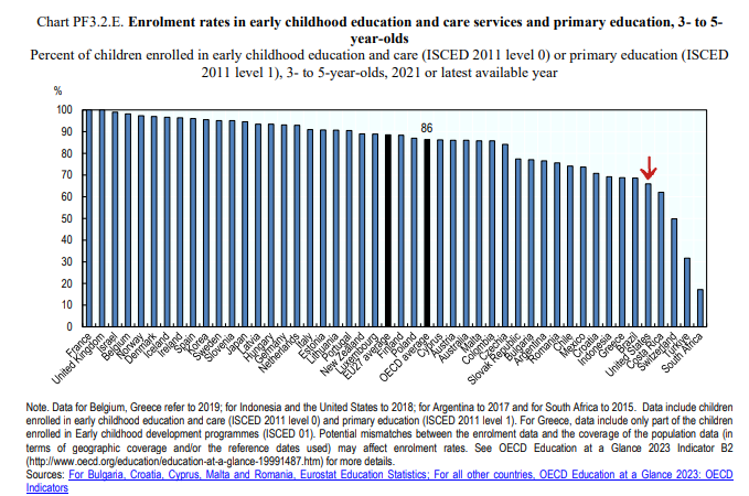 Japan is known for its near 100% enrollment rate of 4-year-olds. Japan also routinely ranks in the top 5 for the three subjects tracked in OECD’s student assessment called PISA: math, science, and reading. The UK has a 97% enrollment rate for 4-year-olds. Mexico has an 81% rate. Then there are nations like France, Norway, and Italy, which even have a 90% enrollment rate for 3-year-olds in preschool.