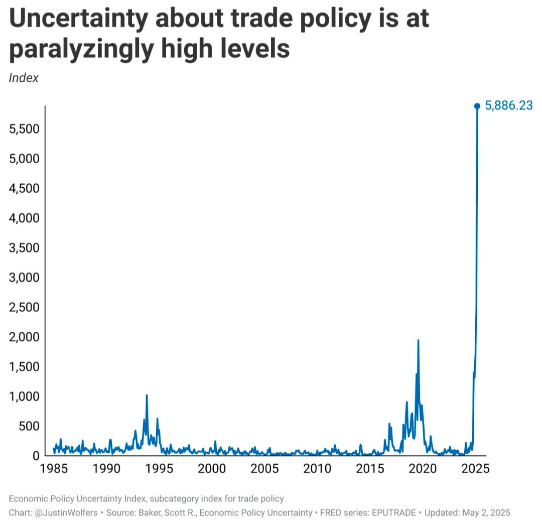 The extreme levels of uncertainty are caused by Trump and Trump alone. His policies change by the day. He enacts tariffs, pauses tariffs, enacts higher ones, claims we never need China again, and then cuts back the tariffs to lower the cost of Chinese products. There is no expert knowledge, no research, and no long-term goal. It is whatever Trump feels like in that moment, which means no one can do business with or in the United States because it is impossible to plan investments.